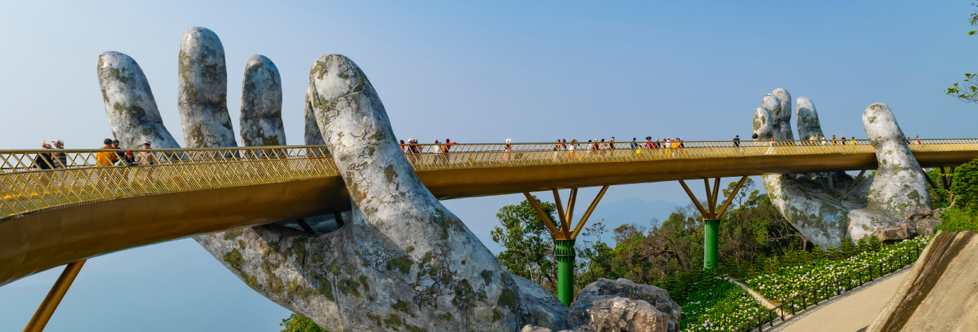 說到巴拿山,怎麼能不提到那座人氣「金橋」呢?巴拿山海拔約1,487公尺,為著名避暑勝地。其中則以「佛手橋」最廣為人熟知,一雙巨大的手托住金色橋墩,橋身蜿蜒的曲線輕盈而曼妙。搭配上周圍綿延的青山,腳下流動的雲層,彷彿置身縹緲的仙境一般,可以說是大家絕對不能錯過的峴港景點!