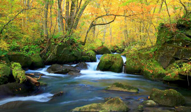 位於青森縣和秋田縣的邊界上的海拔 400 米的山上,這是雙層破火山口湖,代表東北的美麗湖泊。湖面於標高 440 公尺的高山上,湖周長約44公里,最深的地方達327米,是日本第三深的湖泊。岸邊斷崖很多,陡峭的好像岸上樹木都要落到湖裡似的。春來一片新綠,秋天滿山紅葉,冬有北國雪景,碧綠清澈的湖水映出各具特色的四季應時的自然風貌,秋天的紅葉,配合上十和田湖的遠離塵囂、幽靜閒適的環境,為遊客帶來完美的旅遊享受。
