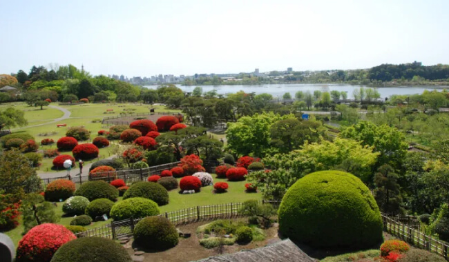 水戶籓(現在的茨城縣水戶市)第9代籓主德川齊昭親自設計規劃的池泉迴遊自然風景式的大名庭園,和金澤的兼六園及岡山的後樂園同稱日本三大名園。為佔地47萬平方公尺,世界上面積第二大,僅次於紐約中央公園的都市公園。春天的櫻花、初夏是深紅的霧島躑躅、盛夏是綠色鮮明的孟宗竹和杉林,秋天可以看到可愛的萩花和楓葉,配上寬廣遼闊的千波湖真可謂為絕景,冬天,銀裝素裹,盡顯北國之魅力。來偕樂園,一年四季都可稱為是最佳時節。