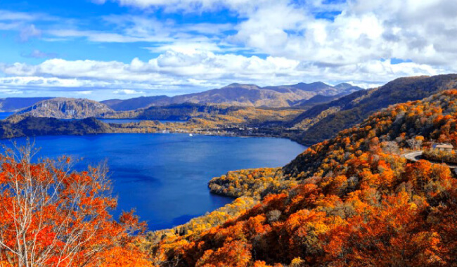 位於青森縣和秋田縣的邊界上的海拔 400 米的山上,這是雙層破火山口湖,代表東北的美麗湖泊。湖面於標高 440 公尺的高山上,湖周長約44公里,最深的地方達327米,是日本第三深的湖泊。岸邊斷崖很多,陡峭的好像岸上樹木都要落到湖裡似的。春來一片新綠,秋天滿山紅葉,冬有北國雪景,碧綠清澈的湖水映出各具特色的四季應時的自然風貌,秋天的紅葉,配合上十和田湖的遠離塵囂、幽靜閒適的環境,為遊客帶來完美的旅遊享受。